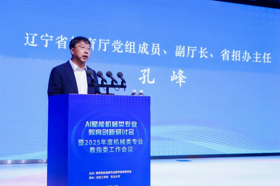 会议开幕式在我校的星河剧场举办。孔峰在开幕式致辞中表示,习近平总书记指出人工智能是引领科技革命和产业变革的战略性技术,国家层面也通过 “人工智能+高等教育”专项行动等部署,为AI与机械教育融合提供指引。辽宁作为 “工业长子”,正处于“传统制造”向“智能智造”转型关键期,始终紧跟国家战略步伐,将AI赋能机械类专业教育作为推动产业升级、实现振兴突破的重要抓手,已通过《辽宁省加快发展新质生产力实施方案》《辽宁教育现代化2035》明确AI与机械专业融合方向。推动AI与机械类专业教育深度融合,不仅是一场教育变革,更是一场关乎辽宁未来产业竞争力的战略行动。他希望院士为辽宁的机械类教育“把脉支招”,在专业顶层设计、关键技术突破等方面给予高屋建瓴的指导,各位教指委委员立足各高校教学实践,聚焦课程体系重构这一核心主题,打造一支既懂机械又通智能的“双师型”教师队伍,省教育厅将全力提供政策与资源支持,助力探索辽宁特色发展路径,为辽宁制造业高质量发展和国家创新驱动发展战略贡献更大的力量。