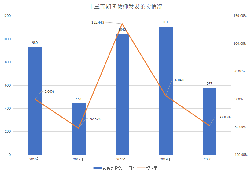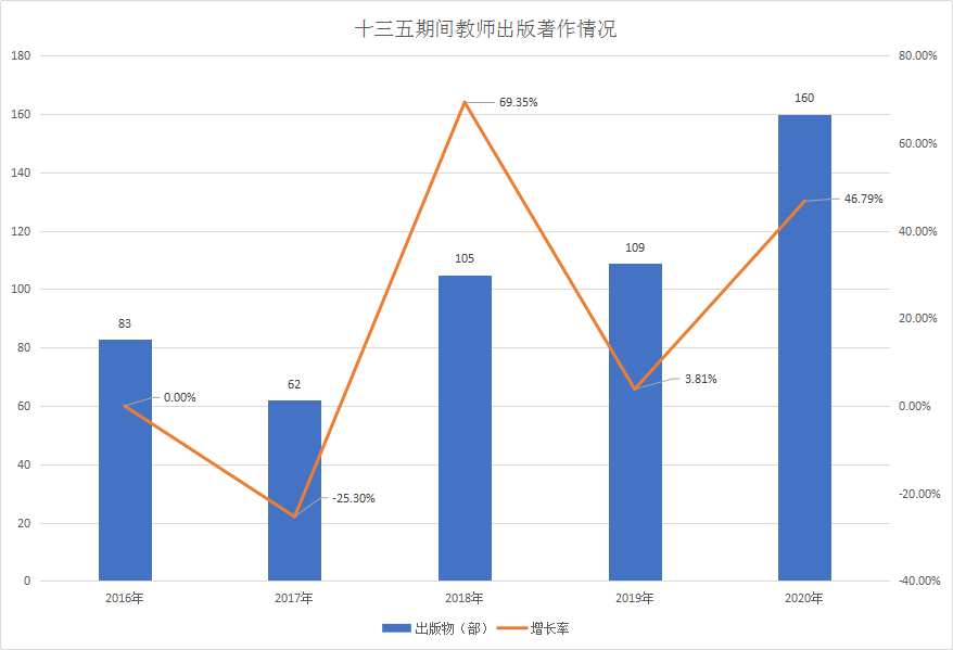 科学研究 Scientific research 首页 - 科研成果 - 正文 - 科研平台 国家级平台 省级平台 校级平台 - 科研服务 校企共建 国际合作 服务地方 - 科研项目 国家级项目管理 省部级项目管理 市厅级项目管理 校级项目管理 - 科研成果 - 学术交流 学术组织 学术报告 学术动态 - 科研管理 论文著作 1.论文发表情况 2016—2020年,我校教师共发表论文3876篇,其中包括《科学引文索引》(SCI网络版)收录论文SCI 20篇,《工程索引》(EI)收录论文数55篇,具体趋势如下图所示: 2.著作出版情况 2016—2020年我校出版著作91部,具体趋势如下图所示: