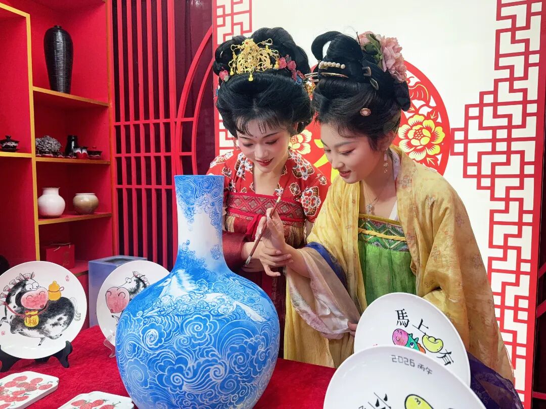 非遗传承人王永亮携手谷宇、蔡福全,与著名歌星孙楠共同打造马年专属惊喜 —— 马年主题天球瓶。王永亮执笔绘就“马踏祥云”吉祥纹样,流畅的线条勾勒出马年顺遂、福气满盈的美好寓意,而孙楠则现场挥毫,为马蹄添上最后一笔浓墨,一技一艺,一笔一画,传统陶瓷匠心与明星风采完美交融,让这件新春限定陶瓷作品成为舞台上的“宝藏藏品”,独特的新春氛围直接拉满!