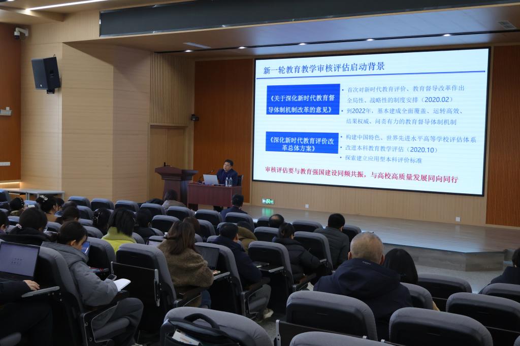 本次培训特邀资深评估专家苏晓明教授作专题报告。苏教授首先系统梳理了普通高等学校本科教育教学审核评估的背景与流程,对评估体系中的各项核心指标点进行了深入浅出的解读与阐释。同时,充分肯定了我校对审核评估工作的高度重视。随后围绕 “以评促建、以评促改、以评促管、以评促强” 的核心要义展开深度剖析,从专任教师能力提升、学工队伍育人实效强化、党政班子统筹协调优化等多个维度,分享了审核评估准备工作的实践路径与经验,并针对自评报告撰写的重点、难点与常见问题进行了解析。最后,苏教授结合地方高校发展实际,就如何推动学校高质量发展提出了理念更新、学科专业调整、积极推动教育教学改革、加强师资队伍建设、服务地方经济发展等方面富有建设性的思考与建议。
