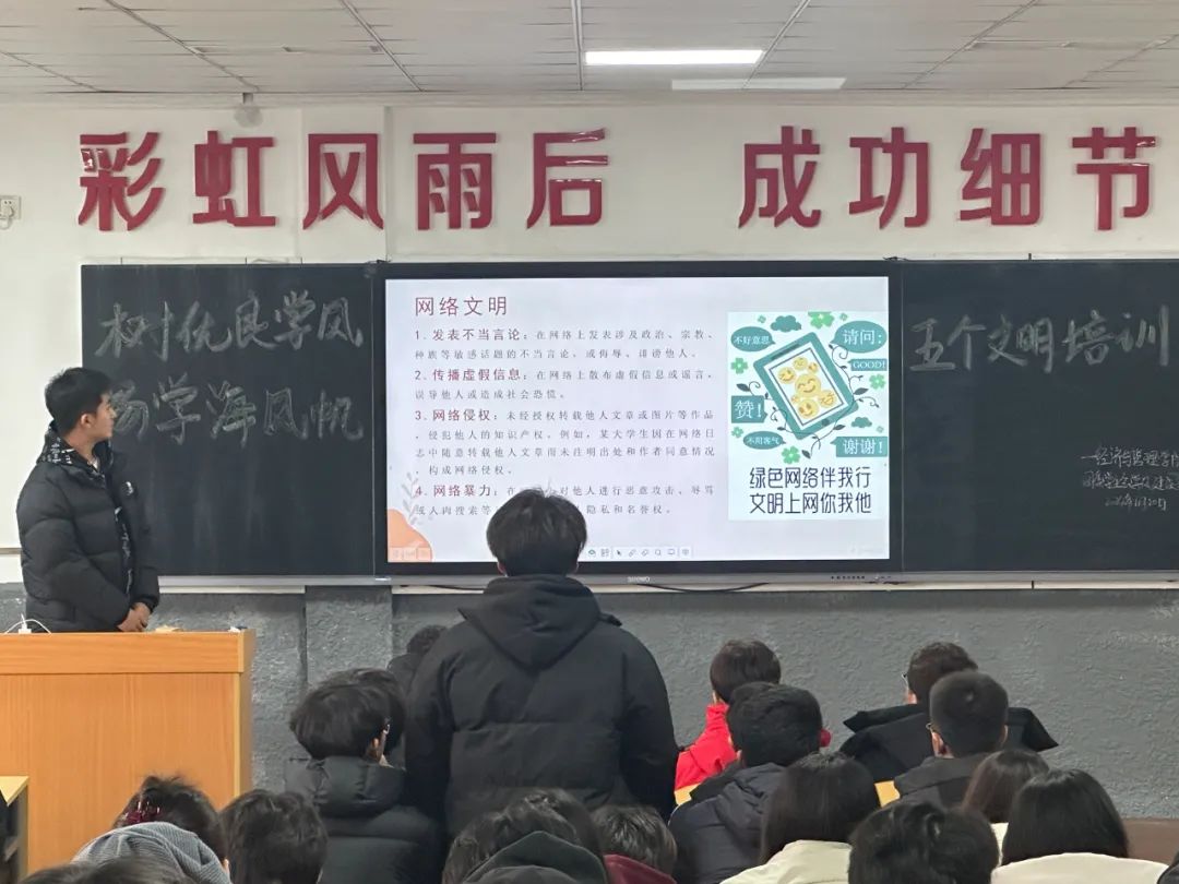 为营造一个和谐、文明、秩序井然的校园环境,展现当代大学生的良好风貌,经济与管理学院团委学生会学风建设部于11月20日在C202面向22、23、24级各班班委成功举办了“树优良学风,扬学海风帆”为主题的五个文明培训活动。此次活动的目的是为了让同学们接受文明礼仪的熏陶,养成文明的行为习惯,共同营造一个良好的学习和生活环境。