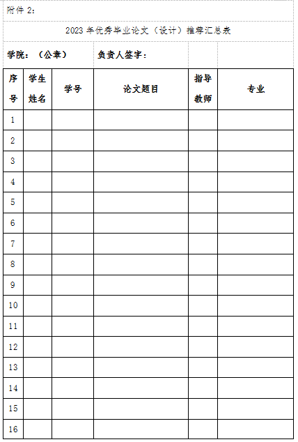 1.各学院按规定比例推荐候选毕业论文(设计)并填写《本科生优秀毕业论文(设计)申请表》(见附件1),申请表中的申请理由不少于200字;各学院分学术委员会对候选论文投票表决,填写《2023年优秀毕业论文(设计)推荐汇总表》(见附件2)。