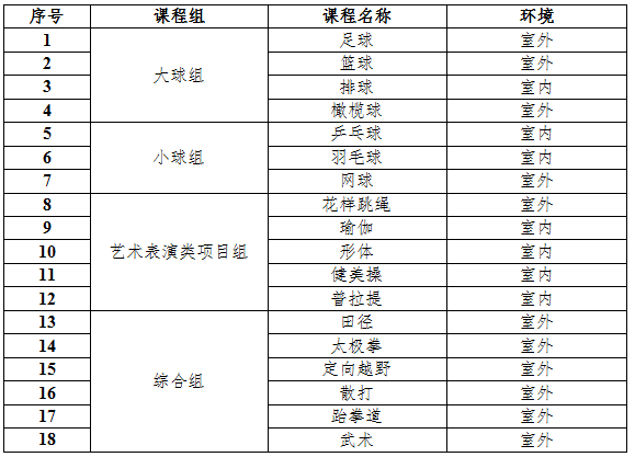 1.选课方式为网上报名,只能选择一门体育项目并根据个人兴趣爱好和技能水平进行选择。选课内容如下表: