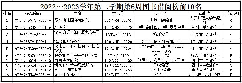 2022~2023学年第二学期第6周图书借阅榜前10名