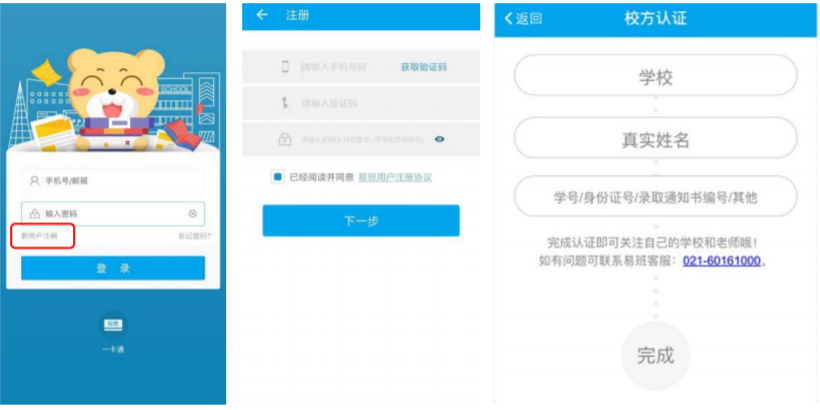 2.安装完成后,点击进入易班,选择“新用户注册”,输入手机号、密码及短信验证码后点击“下一步”。