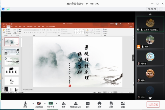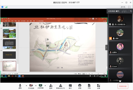 2020年5月28日,5月29日,5月30日艺术与传媒学院风景园林专业于腾讯会议平台开展了《景观设计原理》结课答辩。课程《景观设计原理》指导教师刘昶,本次答辩风景园林专业吴婧舒,李睿,张曦文莅临本次结课答辩。景观设计原理课程是风景园林专业学生的一门专业选修课,是考查课。景观设计原理能够使学生对景观设计中理论知识有一定了解,培养学生深厚的设计修养,形成完整的知识结构和综合的设计观。以便较好地为学生日后学习的设计课程中的相关知识打下坚实的基础。通过本门设计课程的学习,使学生能够掌握景观设计的相关知识,理解其设计中的重要意义,了解及掌握景观设计的设计风格、手法、内容及效果表现方式,同时对于设计风格元素也有所掌握,以及其在真正设计中如何应用有所掌握。在教学中强调全面培养学生的知识、能力与素质,尤其是了解景观设计的目标、框架、步骤、内容、方法、技术以及相关的政策与法规。通过本课程学习,建立起风景园林比例尺度观,能够实现自我发现问题、分析问题、解决问题的思维与方法。