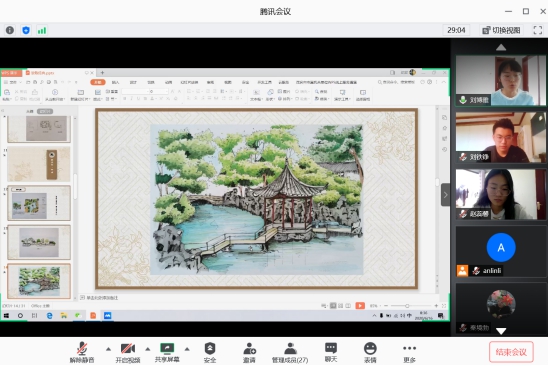 艺术与传媒学院风景园林第一工作室于2020年6月16日星期二,利用腾讯会议平台开展了手绘表现技法和专业认知实践实训课程的答辩。风景园林第一工作室19级全体学生、王宇老师与安琳莉老师共同参与了本次答辩。